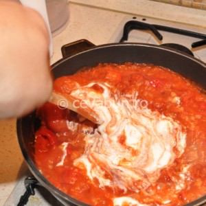 - Adăugaţi roşiile, pasta de tomate şi iaurtul gras. Amestecaţi şi lăsaţi să dea totul câteva clocote.