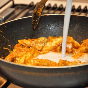- Adăugaţi carnea de pui şi rumeniţi-o în sosul picant.