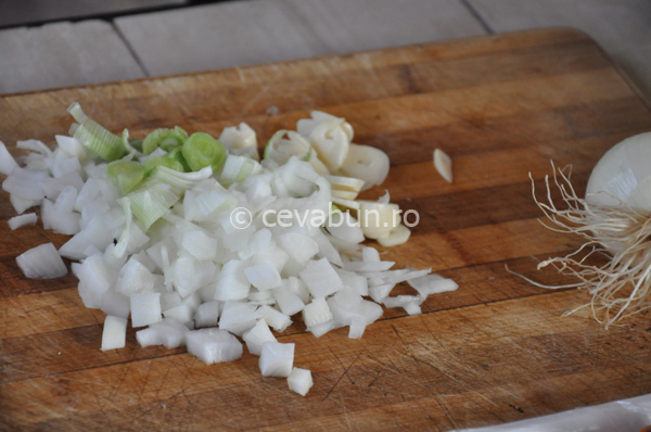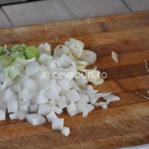 - Curăţaţi ceapa şi usturoiul şi tocaţi-le.