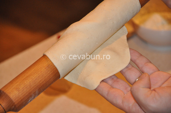 - Rulaţi aluatul pe sucitor (vezi galeria foto) pentru a-l manevra mai uşor.