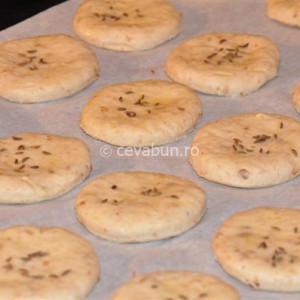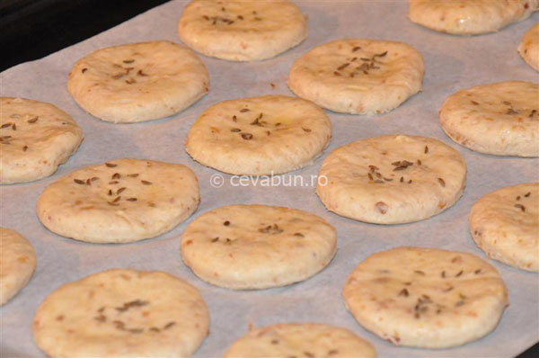 - Se unge fiecare bucată cu gălbenuş de ou, se presară chimen, se aşază în tava de copt (tapetată cu hârtie de copt, de preferință).