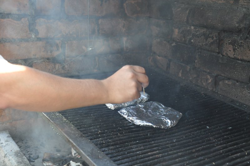 - Scoateţi pieptul de pui din marinată şi înveliţi-l într-o folie de aluminiu unsă cu puţin ulei. Găuriţi din loc în loc folia cu o scobitoare. Aşezaţi puiul “înfoliat” pe grătar şi prăjiţi-l pe toate părţile.