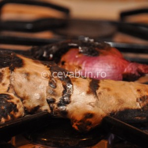 - Spălaţi ceapa şi ghimbirul – fără să le curăţaţi – şi pârliţi-le bine pe flacăra aragazului timp de 8-10 minute. Întoarceţi-le pe toate părţile. Se vor înmuia și se vor înnegri (așa și trebuie).