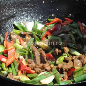 [tip]Vita se frige la foc iute pentru a se rumeni în exterior şi păstra suculentă în interior.[/tip] - Adăugaţi ceapa, urechile de lemn (scurse de apă), ardeiul gras, mugurii de bambus şi porumbul.