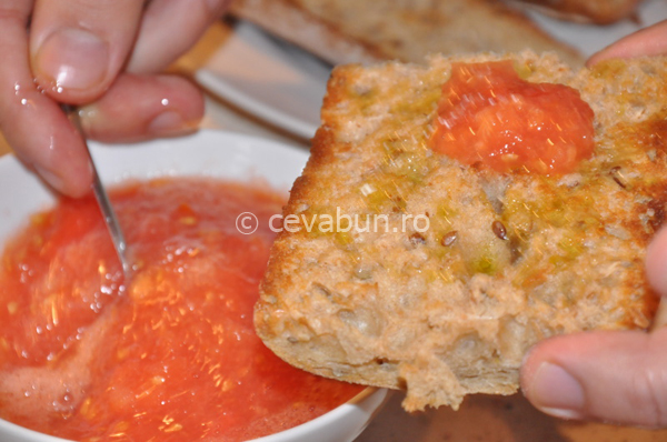 [note]În mod tradiţional, se folosesc roşii foarte coapte, care se freacă direct de felia de pâine.[/note]
