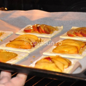 - Aşezaţi bucăţi de fruct pe foietaj uşor suprapuse, în careul interior, circular pe bucăţile rotunde sau linear pe pătrate sau dreptunghiuri (vezi foto).